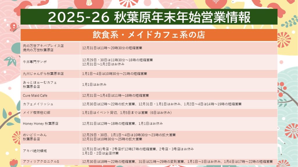 2025年もあと5日をきりました。2026年最初の日曜日である1月4日までにかけての秋葉原にある各店舗の営業情報をまとめました。
