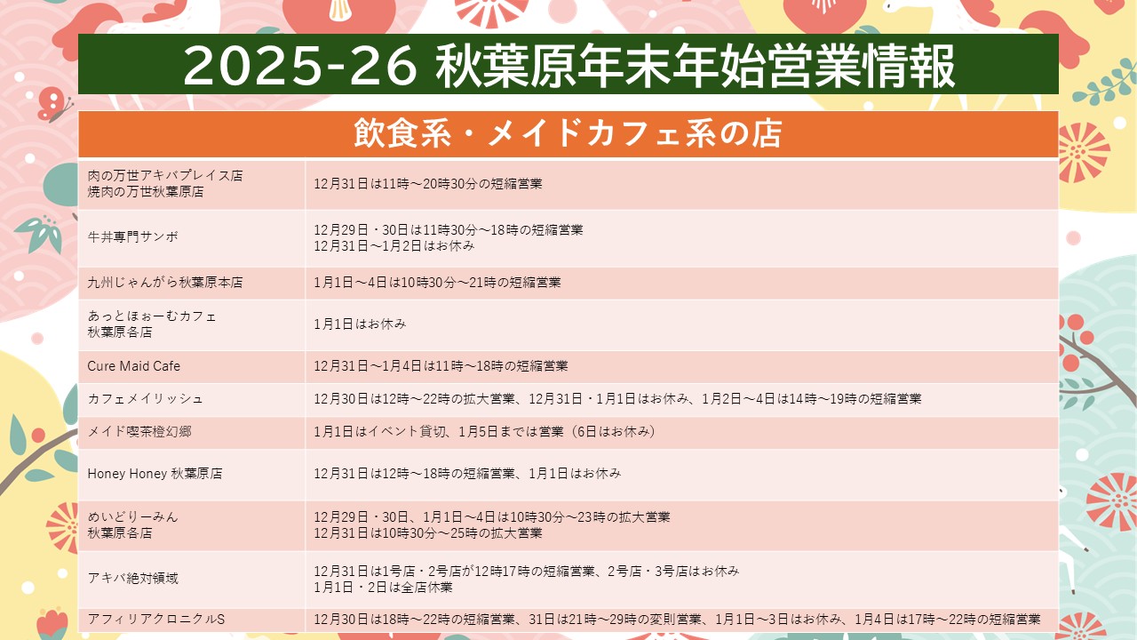 2025年もあと5日をきりました。2026年最初の日曜日である1月4日までにかけての秋葉原にある各店舗の営業情報をまとめました。